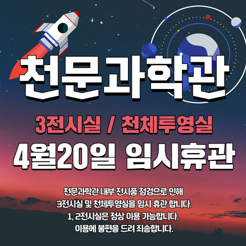 저희 천문과학관은 내실있는 천문교육프로그램의 개발 및 운영에 최선을 다함으로써 항상 새롭고 볼거리 가득한 천문과학관이 되도록 노력하겠습니다.